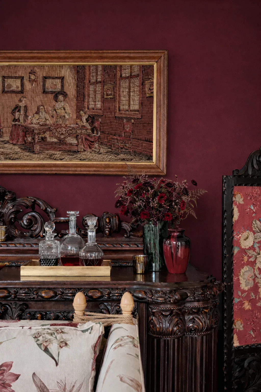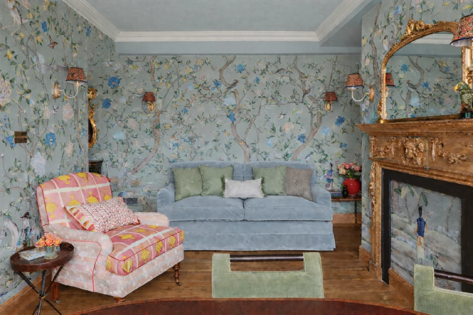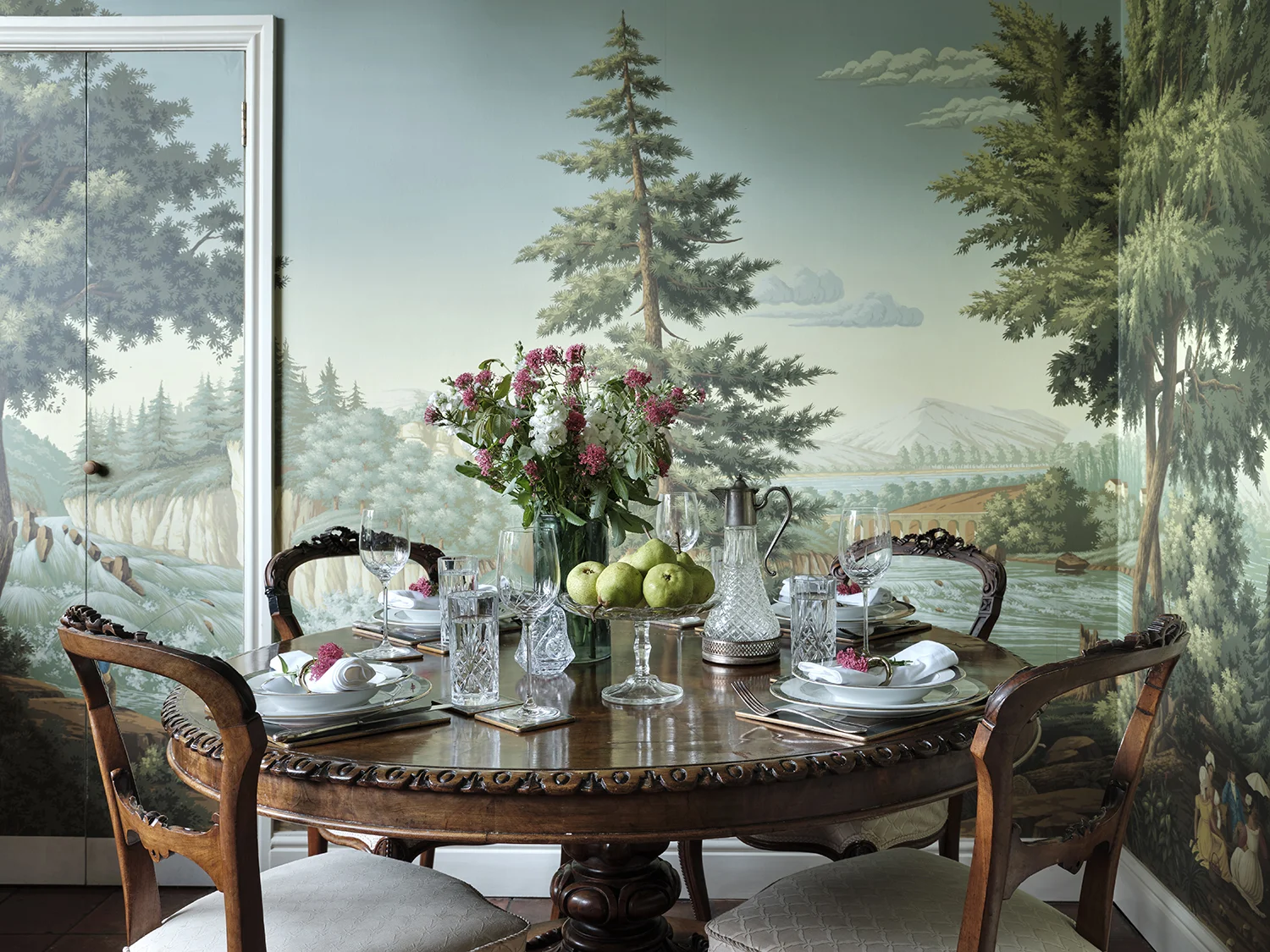 The project, led by Tia Kirwan Interiors, involved a full-house refurbishment and was completed over two years, allowing the interiors to evolve thoughtfully and organically. The drawing room is layered with antiques and enveloped in a deep burgundy wallcovering, creating warmth, intimacy, and gravitas. In contrast, the dining room features a hand-painted green pine landscape wallcovering by de Gournay, adding depth, narrative, and a painterly quality to the space.