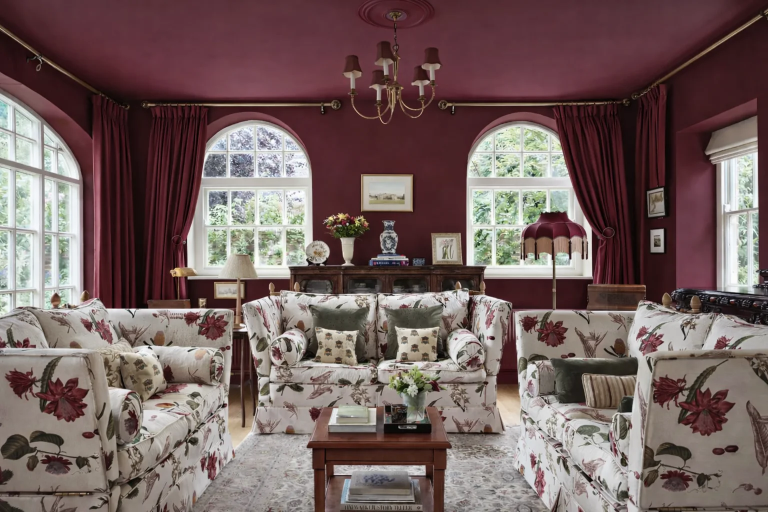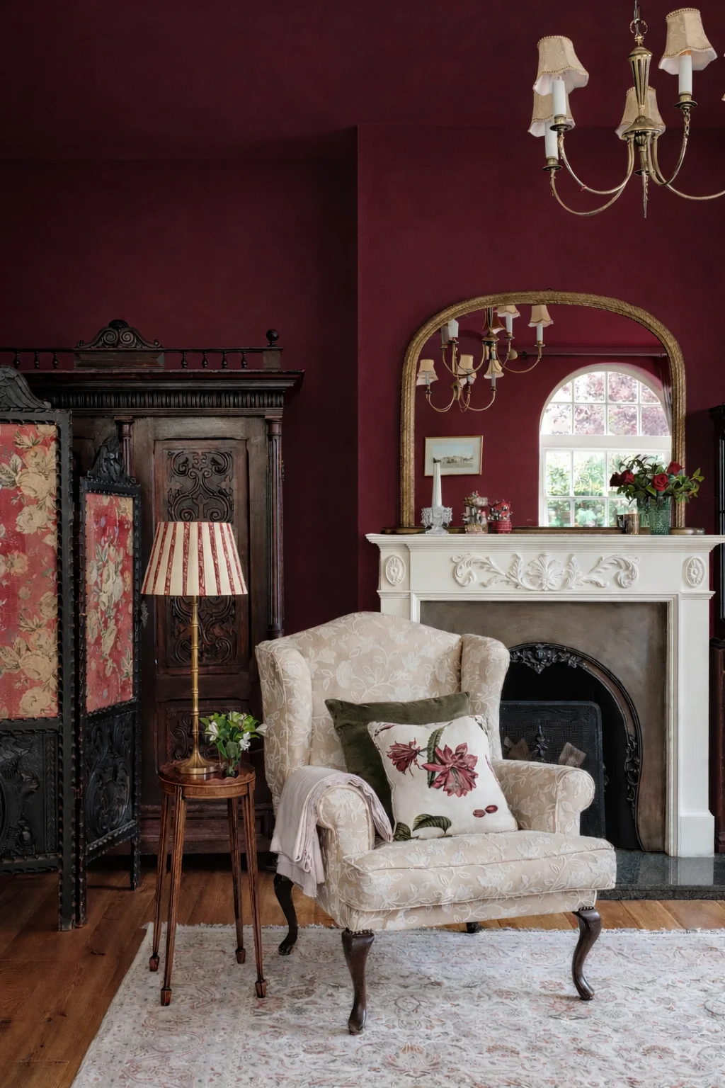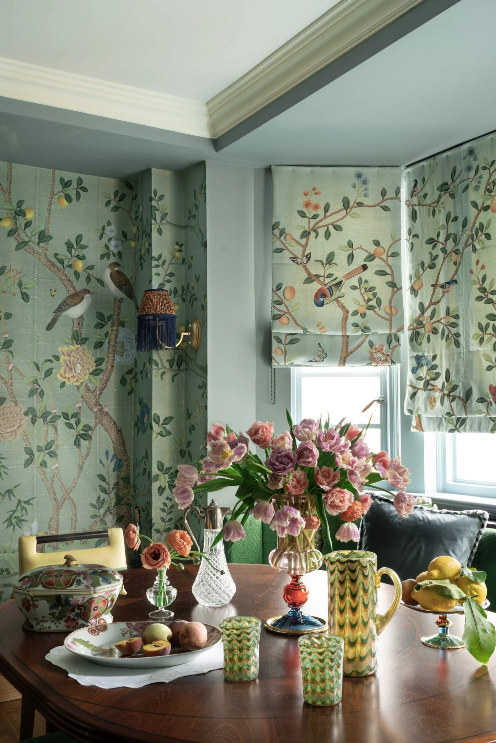 The project, led by Tia Kirwan Interiors, involved a full-house refurbishment and was completed over two years, allowing the interiors to evolve thoughtfully and organically. The drawing room is layered with antiques and enveloped in a deep burgundy wallcovering, creating warmth, intimacy, and gravitas. In contrast, the dining room features a hand-painted green pine landscape wallcovering by de Gournay, adding depth, narrative, and a painterly quality to the space.