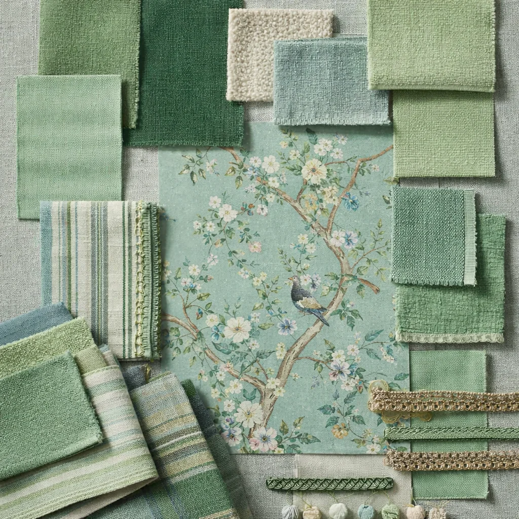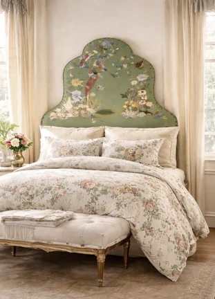 Dining chairs by Kit Kemp, upholstered in a rich green textile selected by Tia Kirwan Interiors, introduce warmth and texture. Vaughan lighting and Soane Britain ironmongery were carefully specified to add further layers of heritage detailing and material richness. The principal bedroom, conceived by Tia Kirwan Interiors as a calm and elegant retreat, is washed in soft blues and greens. A hand-embroidered headboard commissioned from Natasha Hulse serves as a striking focal point, functioning as both artwork and statement.