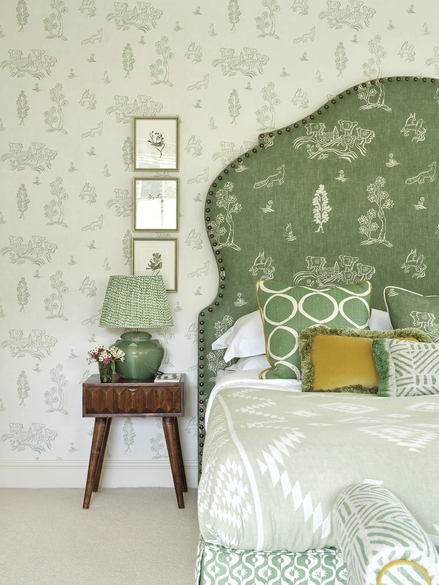 Finishes throughout, curated by Tia Kirwan Interiors, are deliberately tactile and characterful. The home is furnished with a considered mix of antiques sourced from France and Italy, Belgian tapestries, and bespoke pieces. A Robert Kime armchair and cushions from Pimlico sit alongside Andrew Martin fabrics and wallpapers in the principal bedroom. These are complemented by locally sourced flea-market finds, antique plates, handmade lampshades, and carefully selected cushions — all contributing to an eclectic yet cohesive atmosphere.