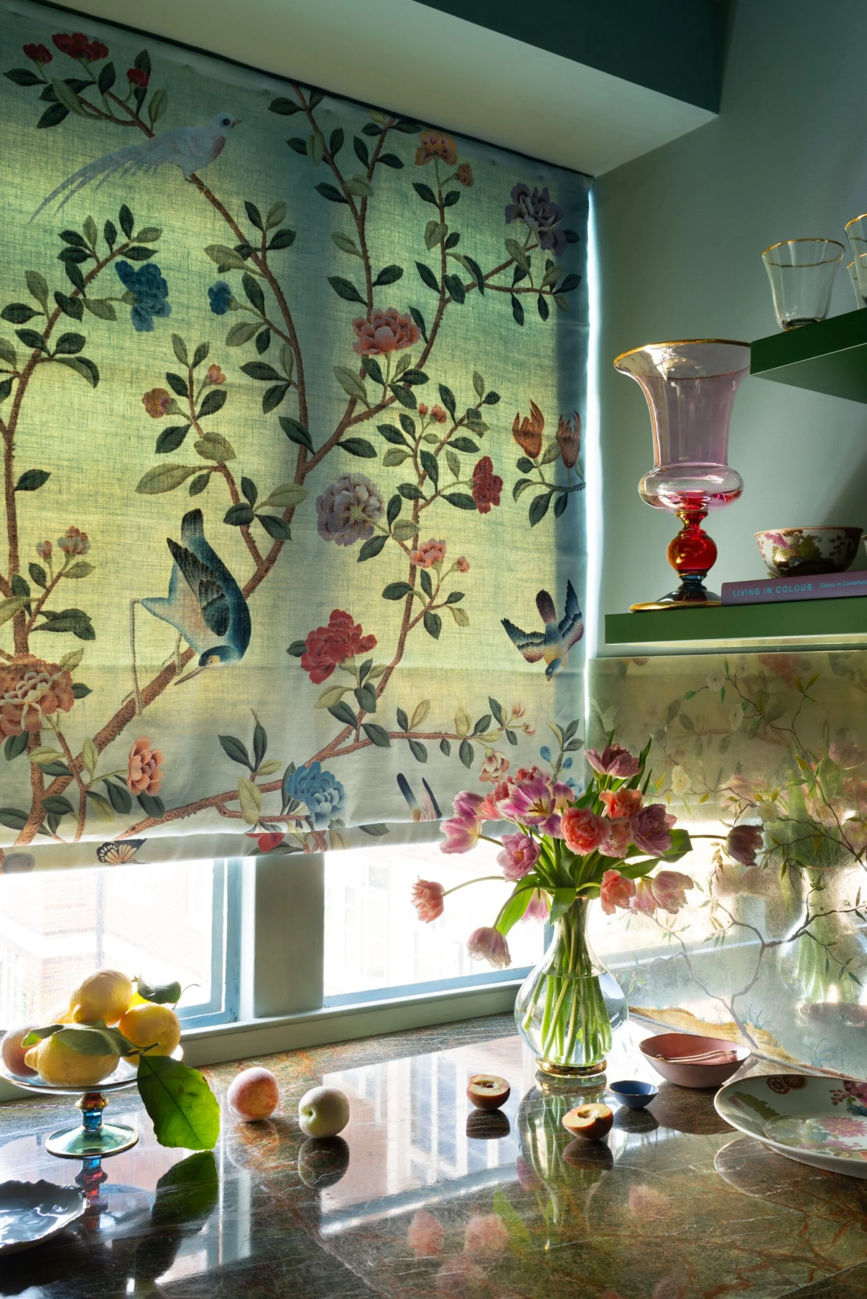 In the adjoining kitchen, Tia Kirwan Interiors designed a hand-painted mirrored splashback that subtly reflects light and echoes the floral motifs, creating continuity and movement throughout the space.